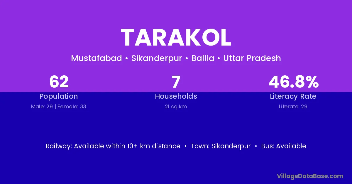 Tarakol village has a total population of 62 people, of which 29 are males and 33 are females.