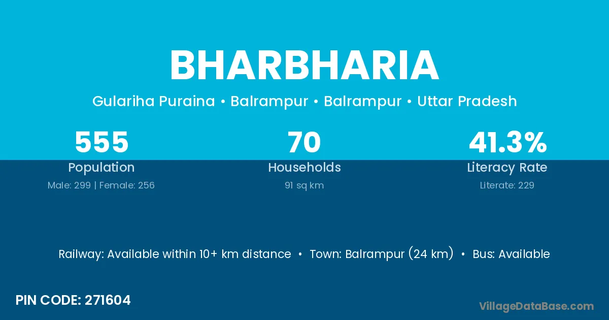 Balrampur (24 km) is the nearest town to Bharbharia village for major economic activities and is located approximately 24 km away.