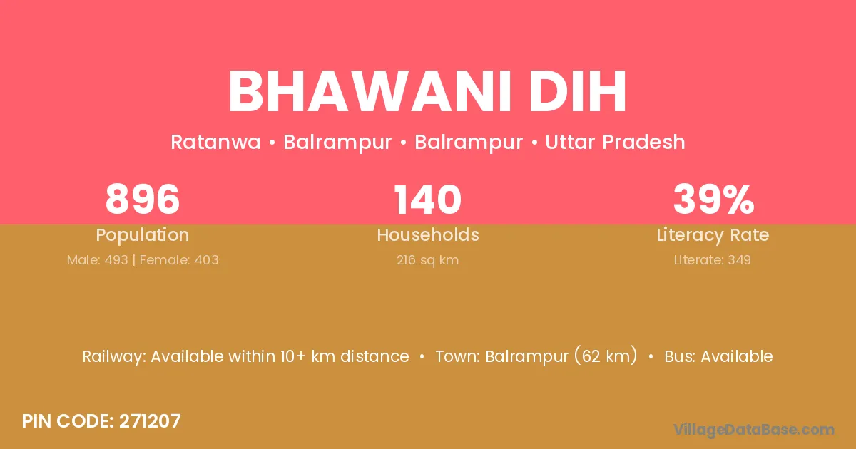 Balrampur (62 km) is the nearest town to Bhawani Dih village for major economic activities and is located approximately 62 km away.