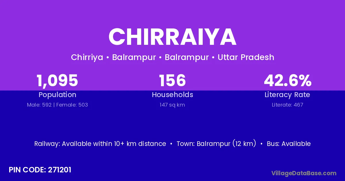 Balrampur (12 km) is the nearest town to Chirraiya village for major economic activities and is located approximately 12 km away.