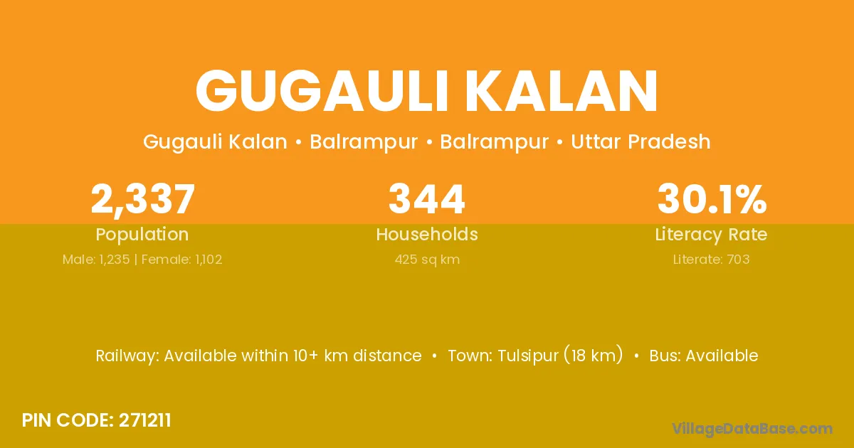 Tulsipur (18 km) is the nearest town to Gugauli Kalan village for major economic activities and is located approximately 18 km away.