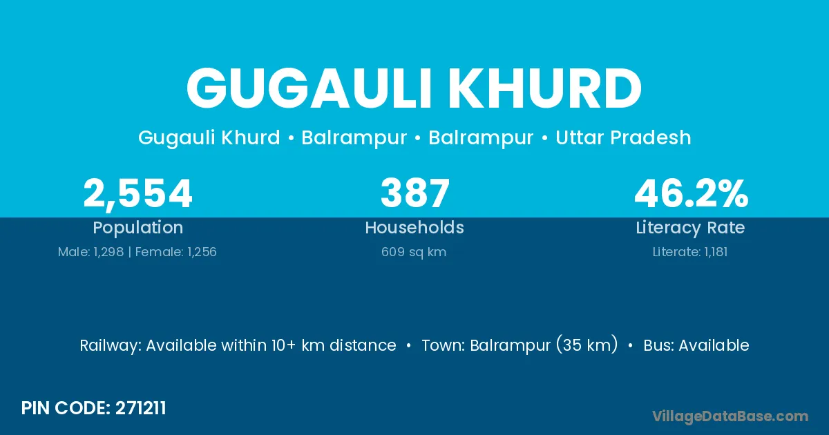 Balrampur (35 km) is the nearest town to Gugauli Khurd village for major economic activities and is located approximately 35 km away.