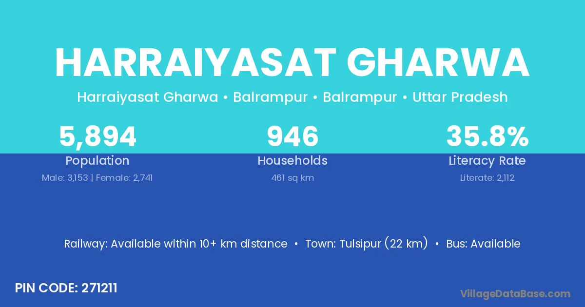 Tulsipur (22 km) is the nearest town to Harraiyasat Gharwa village for major economic activities and is located approximately 22 km away.