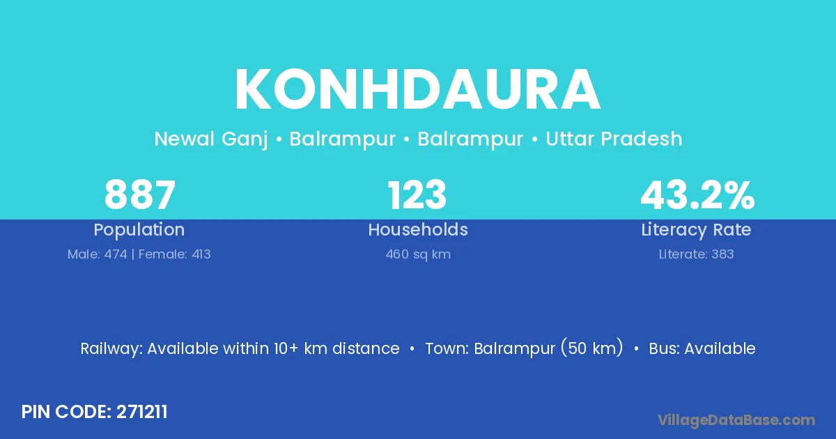 Balrampur (50 km) is the nearest town to Konhdaura village for major economic activities and is located approximately 50 km away.