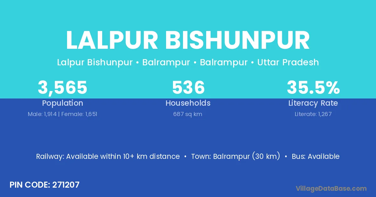 Balrampur (30 km) is the nearest town to Lalpur Bishunpur village for major economic activities and is located approximately 30 km away.