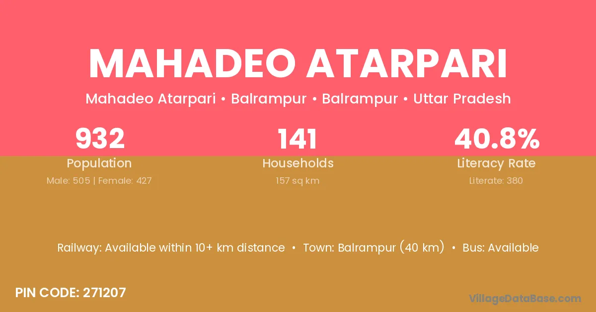 Balrampur (40 km) is the nearest town to Mahadeo Atarpari village for major economic activities and is located approximately 40 km away.