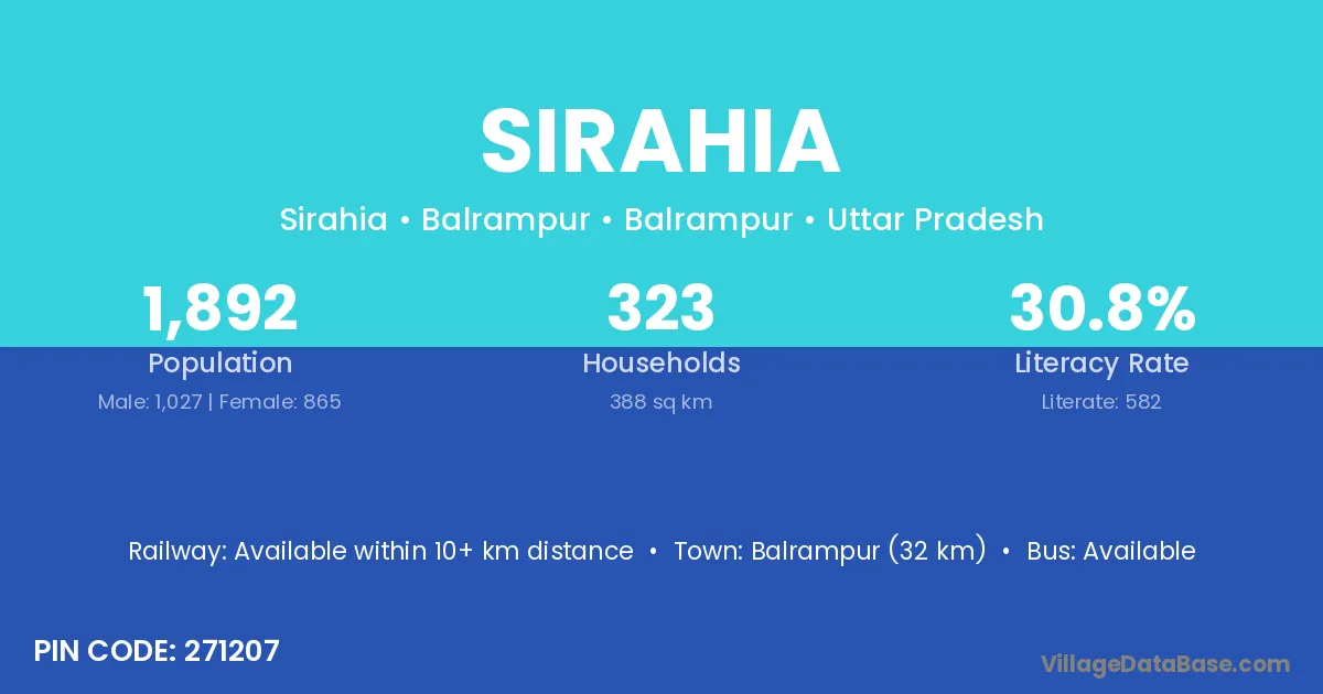 Balrampur (32 km) is the nearest town to Sirahia village for major economic activities and is located approximately 32 km away.