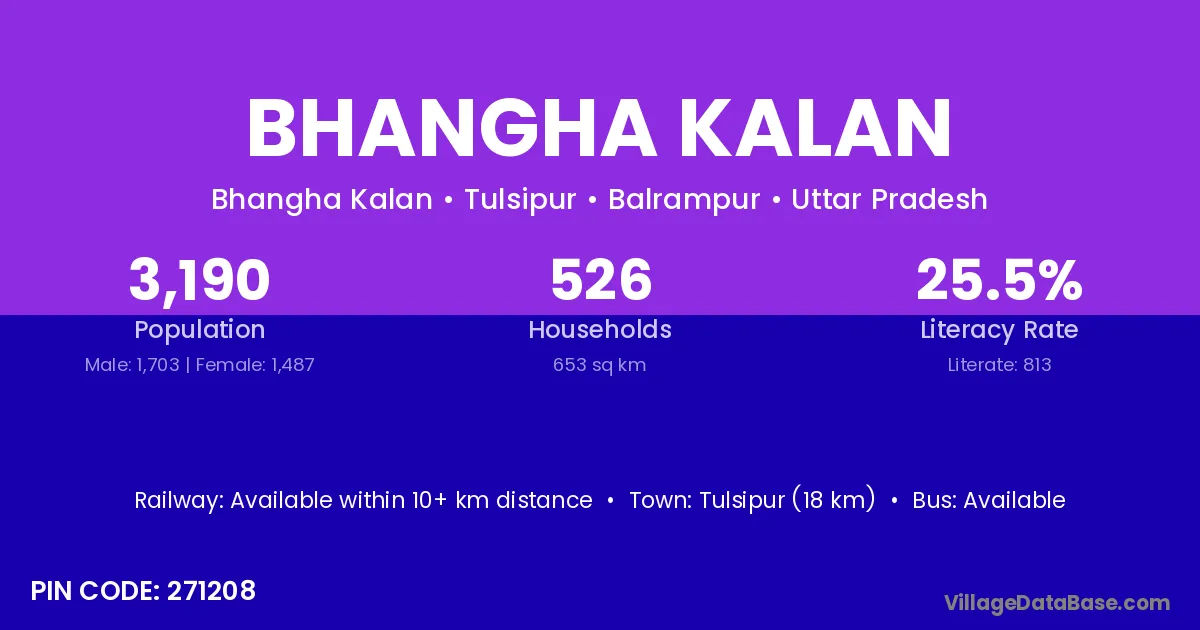 Tulsipur (18 km) is the nearest town to Bhangha Kalan village for major economic activities and is located approximately 18 km away.