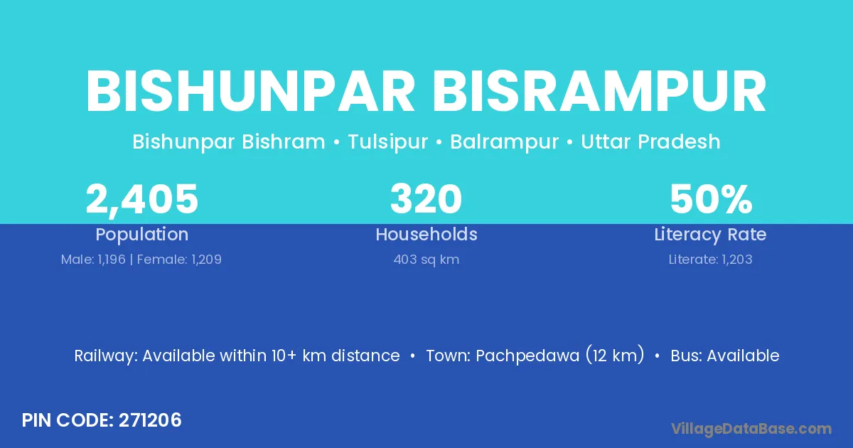 Pachpedawa (12 km) is the nearest town to Bishunpar Bisrampur village for major economic activities and is located approximately 12 km away.