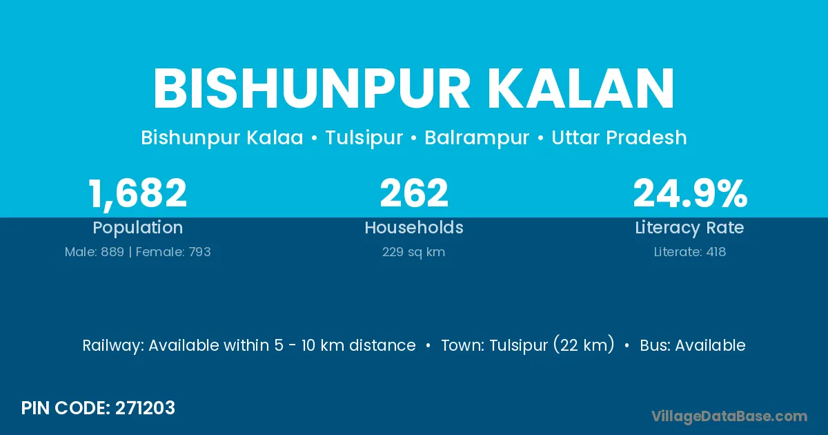 Tulsipur (22 km) is the nearest town to Bishunpur Kalan village for major economic activities and is located approximately 22 km away.