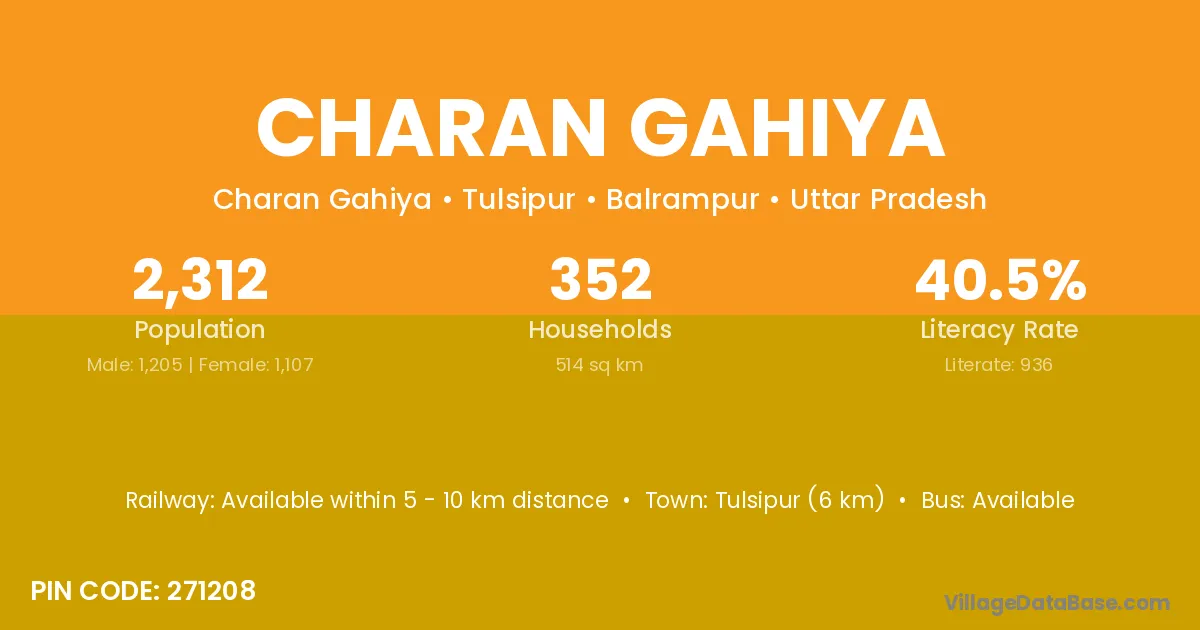Tulsipur (6 km) is the nearest town to Charan Gahiya village for major economic activities and is located approximately 6 km away.