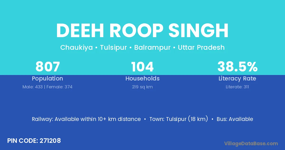 Tulsipur (18 km) is the nearest town to Deeh Roop Singh village for major economic activities and is located approximately 18 km away.