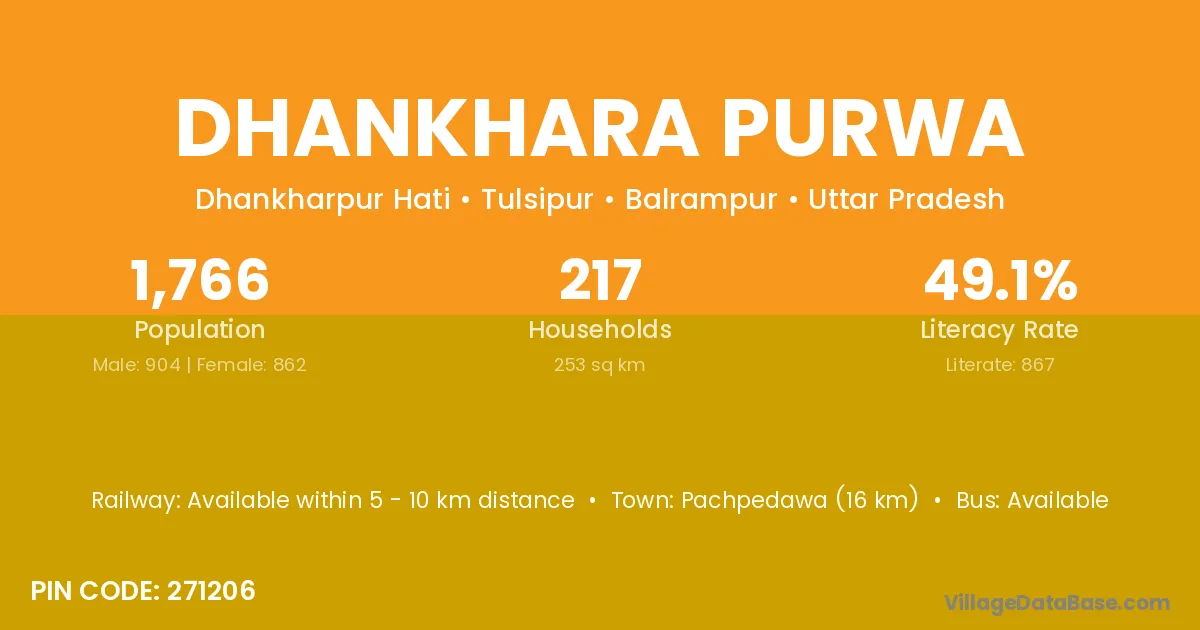 Pachpedawa (16 km) is the nearest town to Dhankhara Purwa village for major economic activities and is located approximately 16 km away.