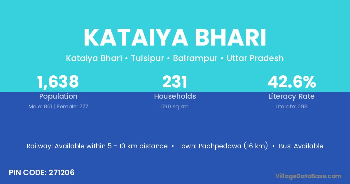 Pachpedawa (16 km) is the nearest town to Kataiya Bhari village for major economic activities and is located approximately 16 km away.
