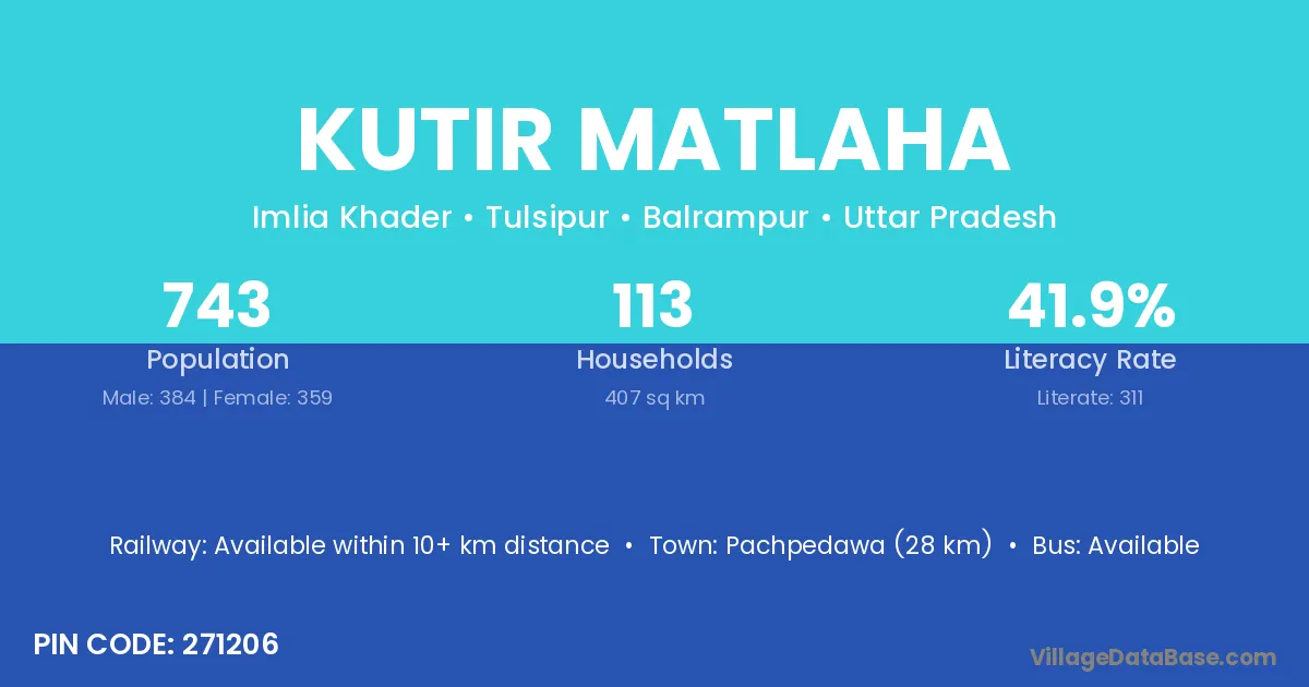 Kutir Matlaha village has a total population of 743 people, of which 384 are males and 359 are females.