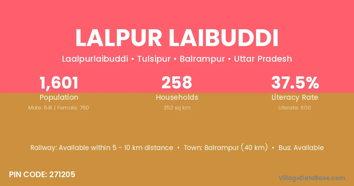 Balrampur (40 km) is the nearest town to Lalpur Laibuddi village for major economic activities and is located approximately 40 km away.