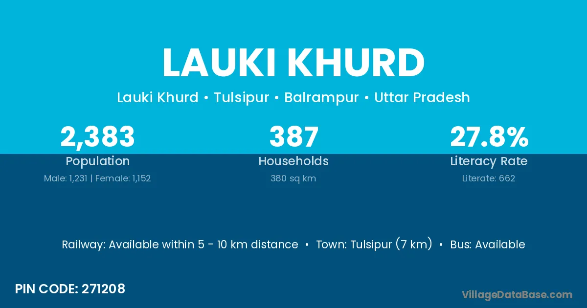 Tulsipur (7 km) is the nearest town to Lauki Khurd village for major economic activities and is located approximately 7 km away.