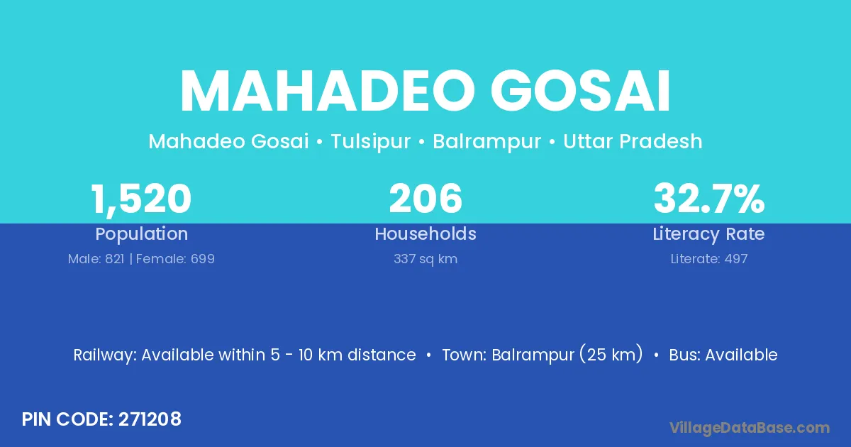 Balrampur (25 km) is the nearest town to Mahadeo Gosai village for major economic activities and is located approximately 25 km away.