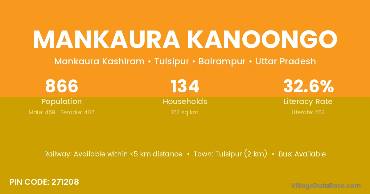 Tulsipur (2 km) is the nearest town to Mankaura Kanoongo village for major economic activities and is located approximately 2 km away.