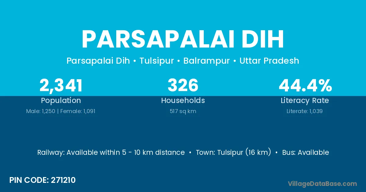 Tulsipur (16 km) is the nearest town to Parsapalai Dih village for major economic activities and is located approximately 16 km away.
