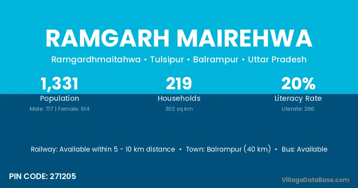 Balrampur (40 km) is the nearest town to Ramgarh Mairehwa village for major economic activities and is located approximately 40 km away.