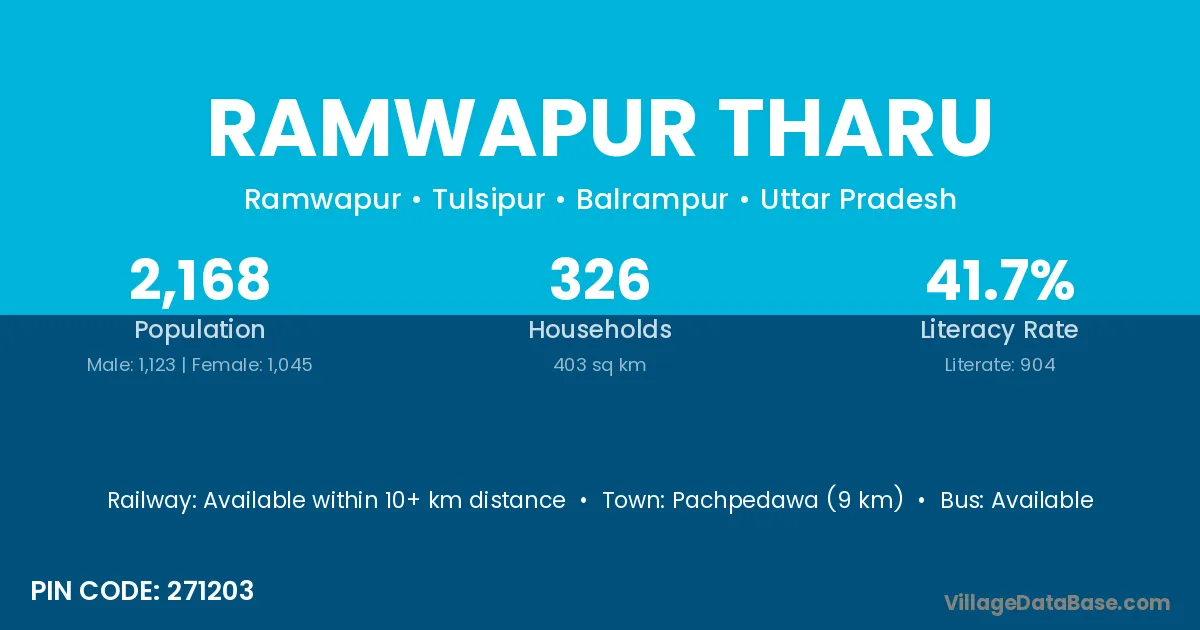 Ramwapur Tharu village has a total population of 2,168 people, of which 1,123 are males and 1,045 are females.
