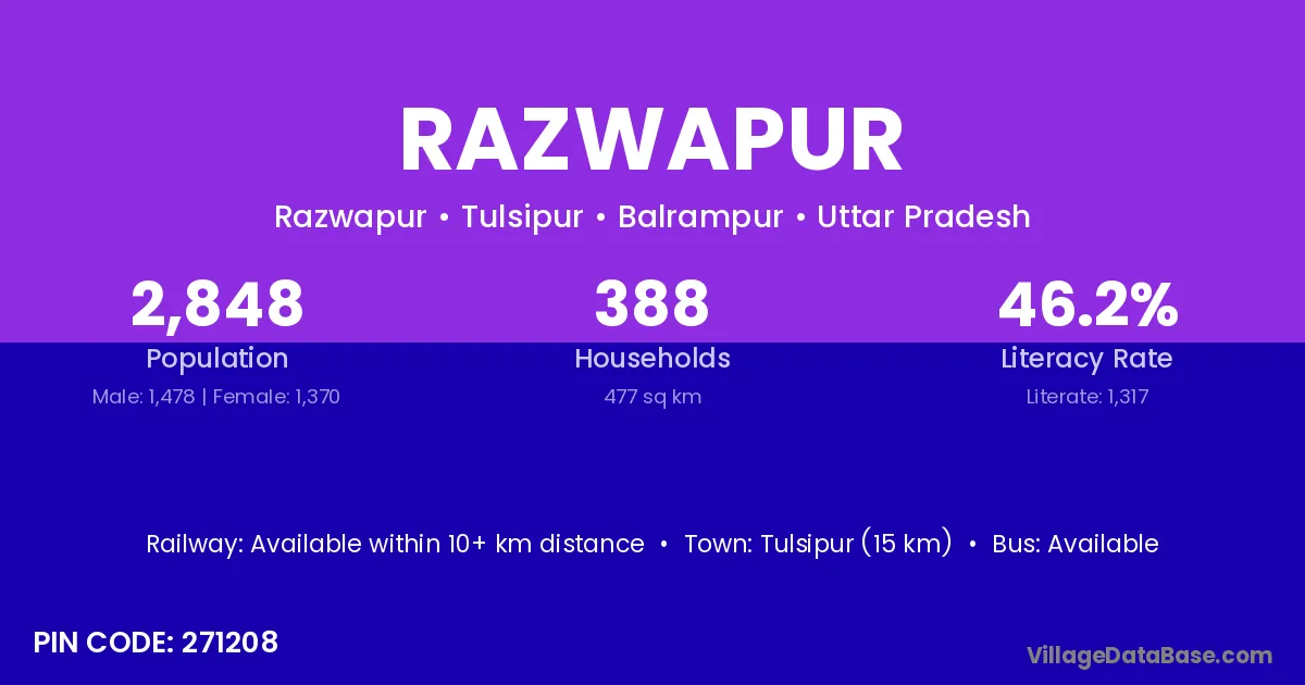 Tulsipur (15 km) is the nearest town to Razwapur village for major economic activities and is located approximately 15 km away.