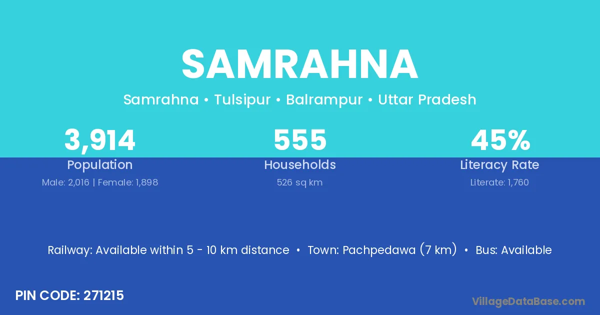 Pachpedawa (7 km) is the nearest town to Samrahna village for major economic activities and is located approximately 7 km away.