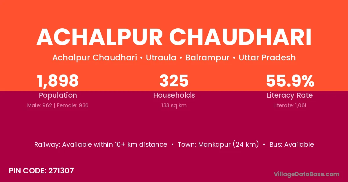 Mankapur (24 km) is the nearest town to Achalpur Chaudhari village for major economic activities and is located approximately 24 km away.