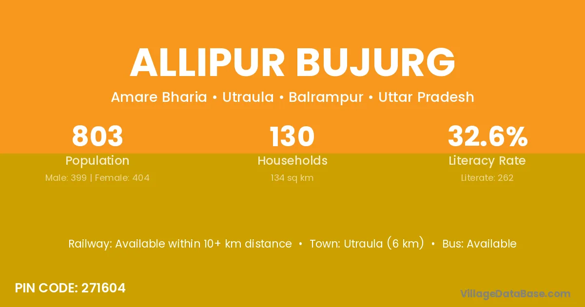 Utraula (6 km) is the nearest town to Allipur Bujurg village for major economic activities and is located approximately 6 km away.