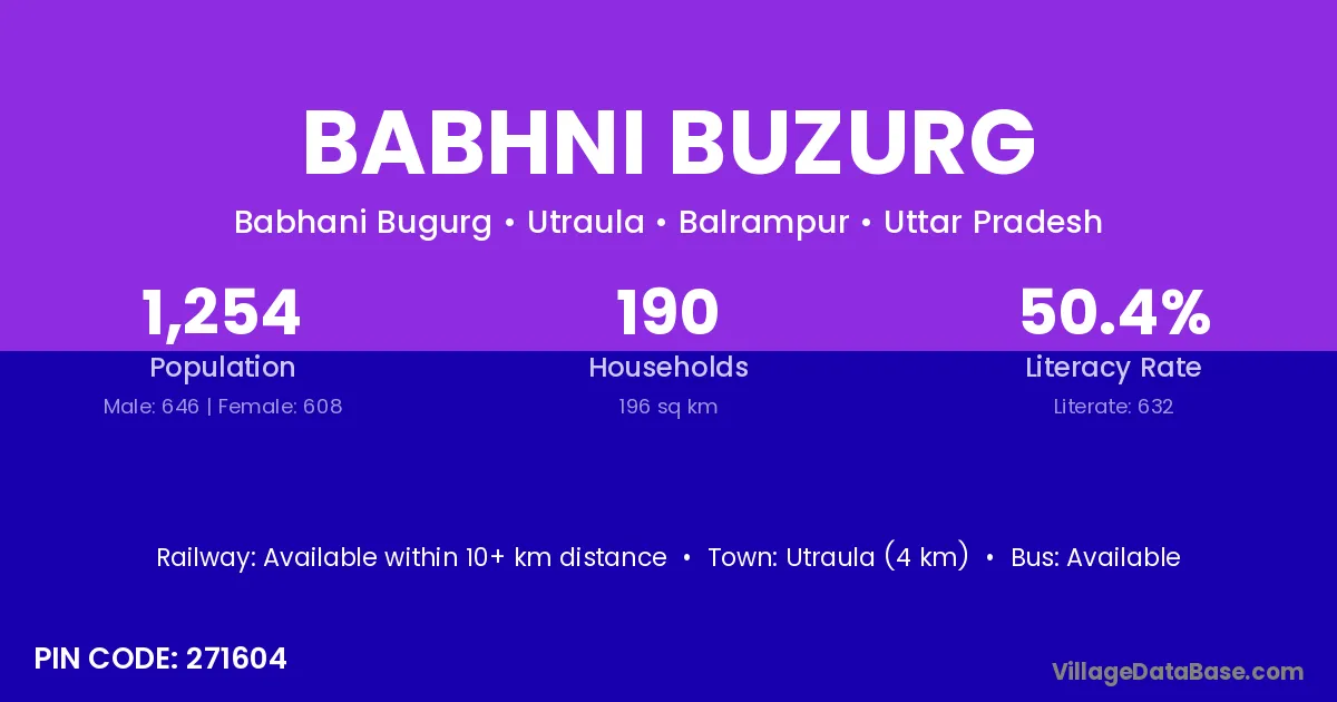 Utraula (4 km) is the nearest town to Babhni Buzurg village for major economic activities and is located approximately 4 km away.