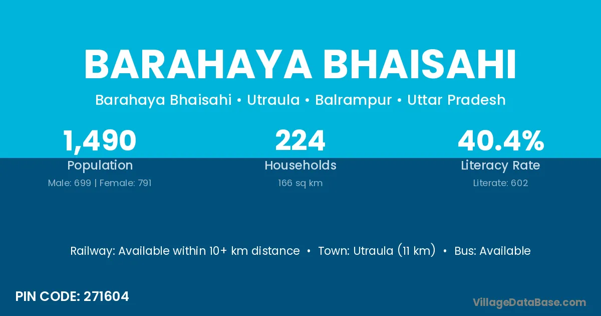 Utraula (11 km) is the nearest town to Barahaya Bhaisahi village for major economic activities and is located approximately 11 km away.