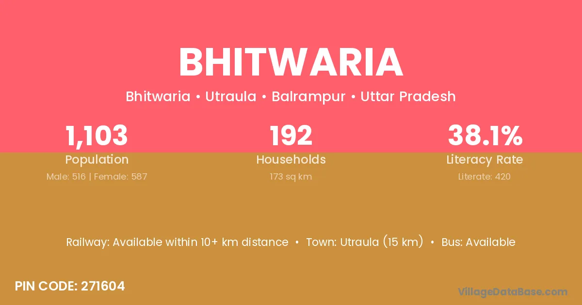 Utraula (15 km) is the nearest town to Bhitwaria village for major economic activities and is located approximately 15 km away.