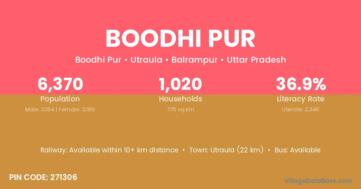 Utraula (22 km) is the nearest town to Boodhi Pur village for major economic activities and is located approximately 22 km away.