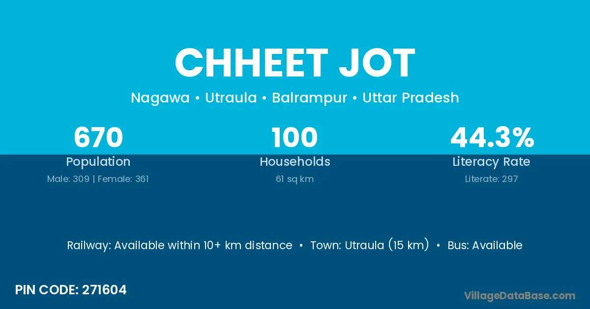 Utraula (15 km) is the nearest town to Chheet Jot village for major economic activities and is located approximately 15 km away.