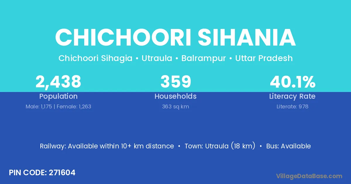 Utraula (18 km) is the nearest town to Chichoori Sihania village for major economic activities and is located approximately 18 km away.