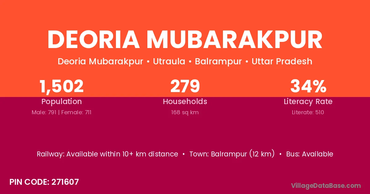 Balrampur (12 km) is the nearest town to Deoria Mubarakpur village for major economic activities and is located approximately 12 km away.