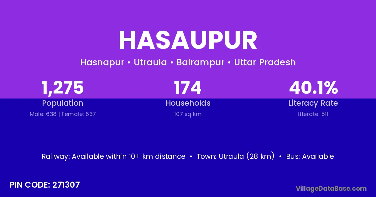 Utraula (28 km) is the nearest town to Hasaupur village for major economic activities and is located approximately 28 km away.