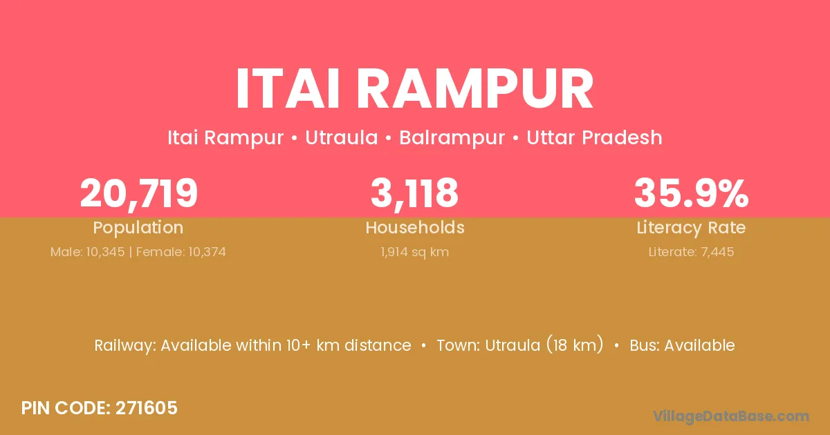 Utraula (18 km) is the nearest town to Itai Rampur village for major economic activities and is located approximately 18 km away.