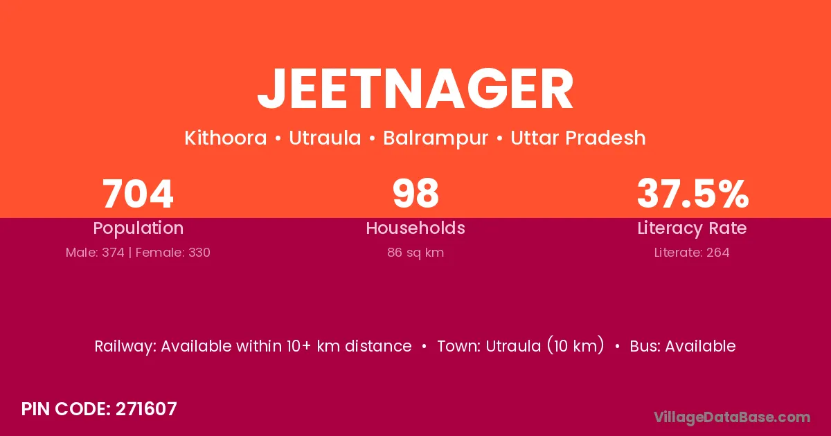 Utraula (10 km) is the nearest town to Jeetnager village for major economic activities and is located approximately 10 km away.