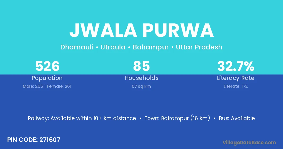 Jwala Purwa village has a total population of 526 people, of which 265 are males and 261 are females.