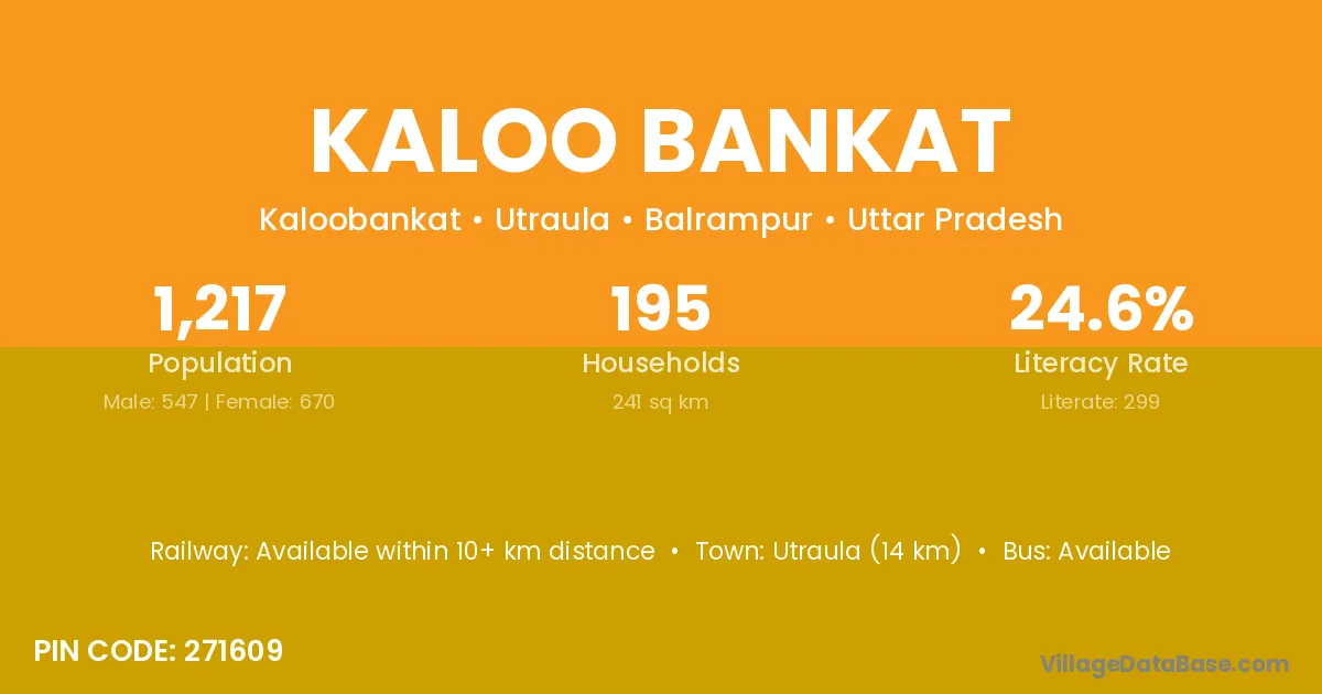 Utraula (14 km) is the nearest town to Kaloo Bankat village for major economic activities and is located approximately 14 km away.
