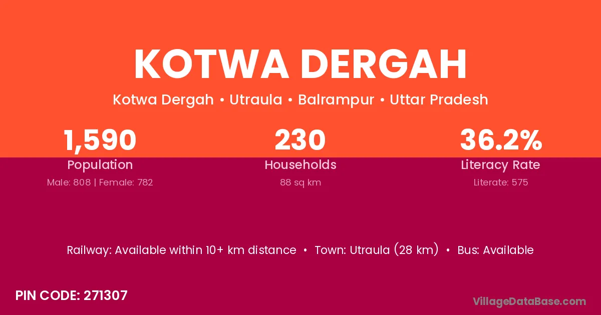 Utraula (28 km) is the nearest town to Kotwa Dergah village for major economic activities and is located approximately 28 km away.