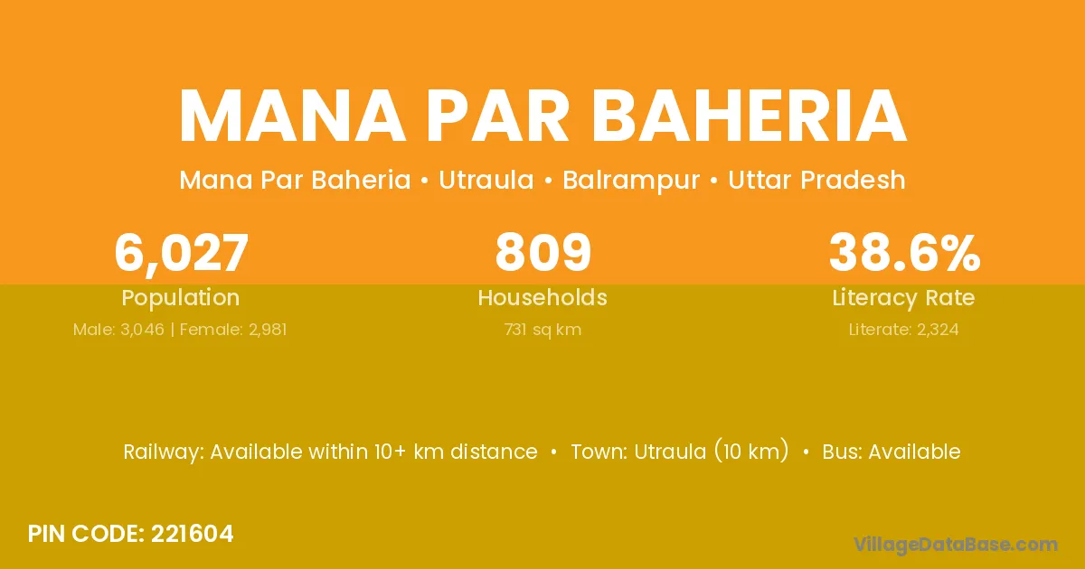 Mana Par Baheria village has a total population of 6,027 people, of which 3,046 are males and 2,981 are females.