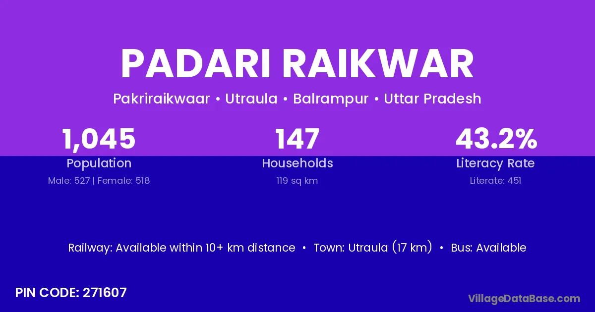 Utraula (17 km) is the nearest town to Padari Raikwar village for major economic activities and is located approximately 17 km away.