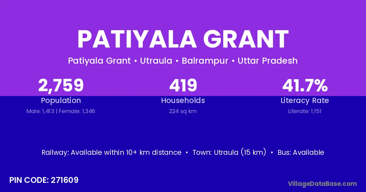 Utraula (15 km) is the nearest town to Patiyala Grant village for major economic activities and is located approximately 15 km away.
