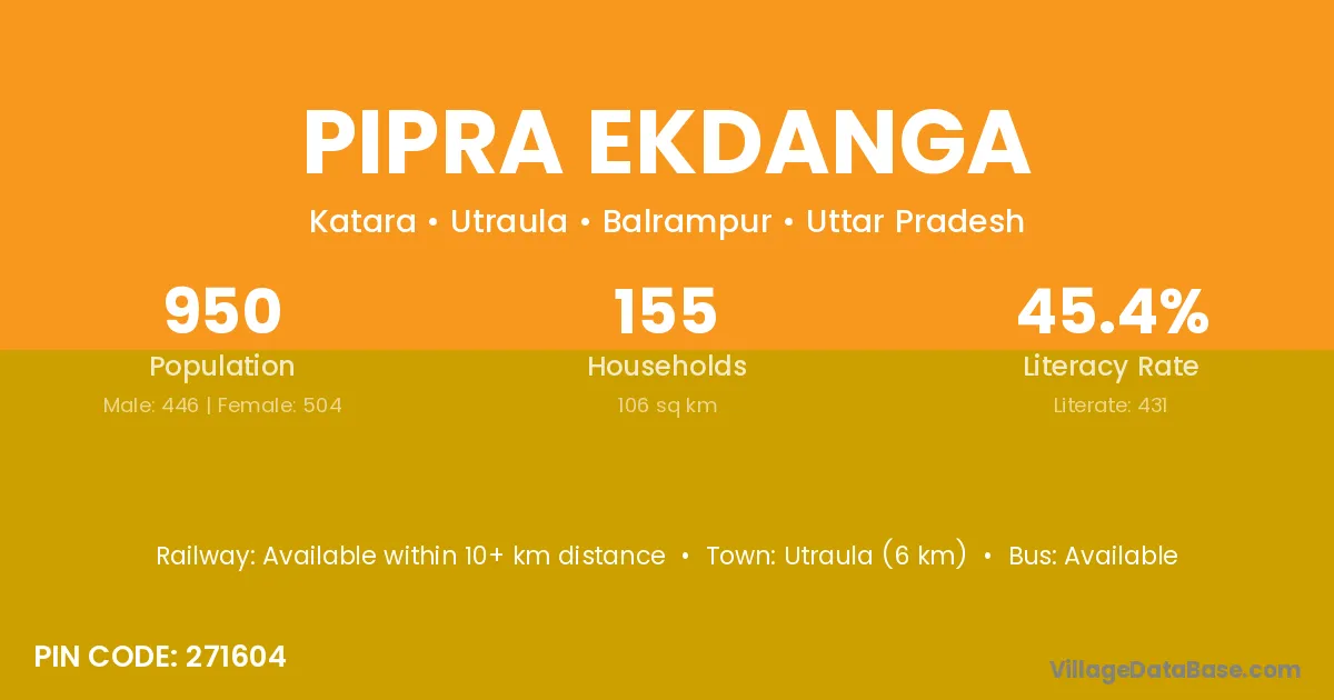 Pipra Ekdanga village has a total population of 950 people, of which 446 are males and 504 are females.