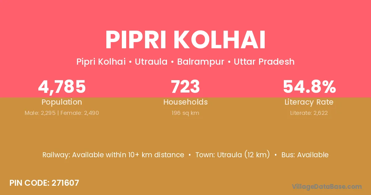 Utraula (12 km) is the nearest town to Pipri Kolhai village for major economic activities and is located approximately 12 km away.