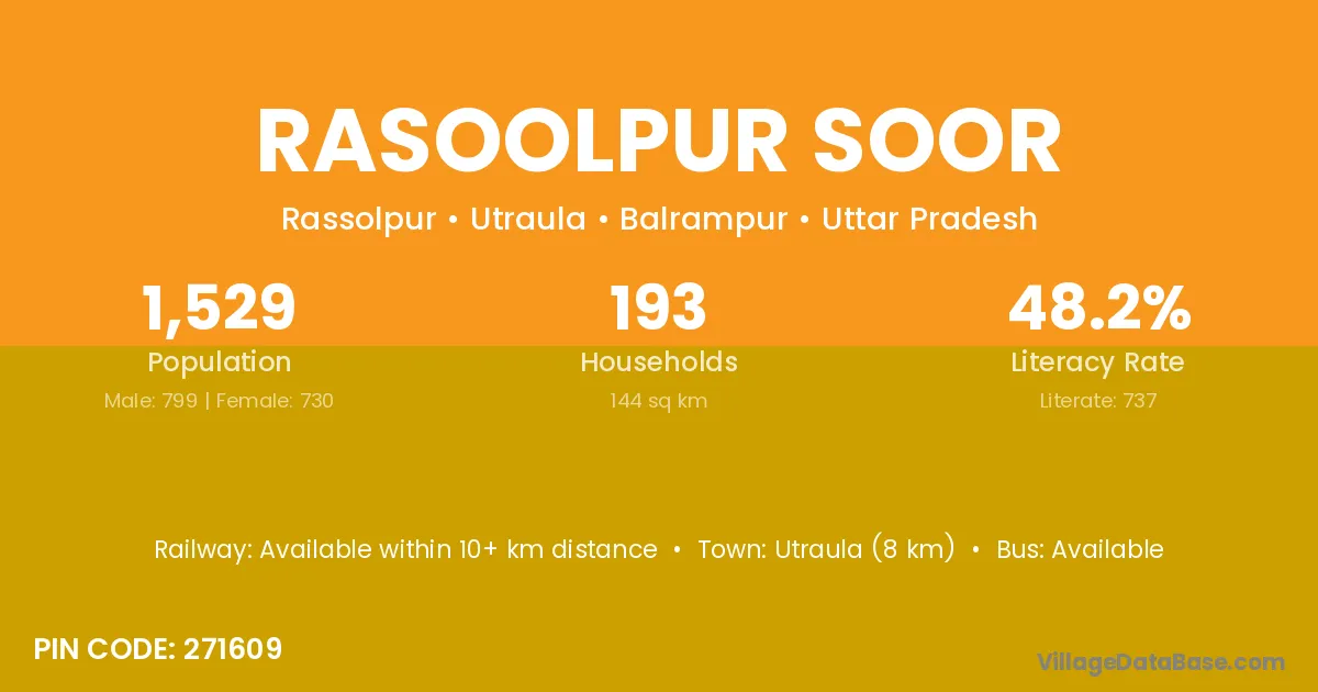 Utraula (8 km) is the nearest town to Rasoolpur Soor village for major economic activities and is located approximately 8 km away.
