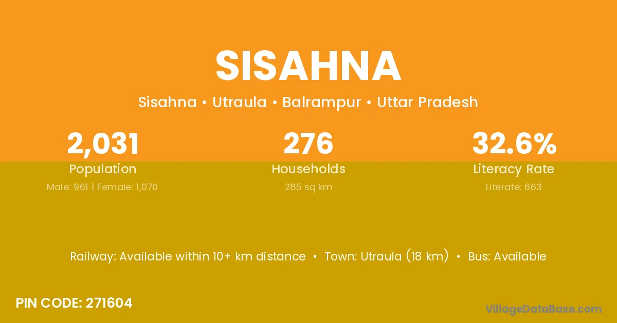 Utraula (18 km) is the nearest town to Sisahna village for major economic activities and is located approximately 18 km away.